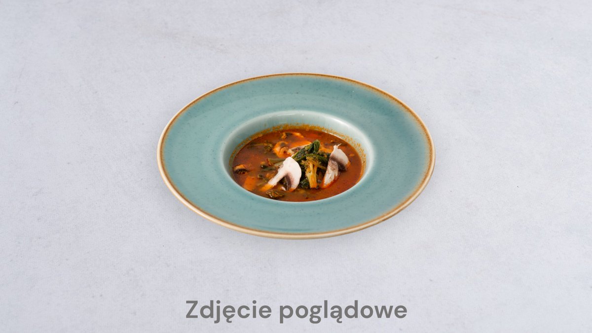 Wywar z pancetty lub warzy z ziołami, grana padano dop, oliwa extra virgin, podane z grzanką z mozzarellą fior di latte