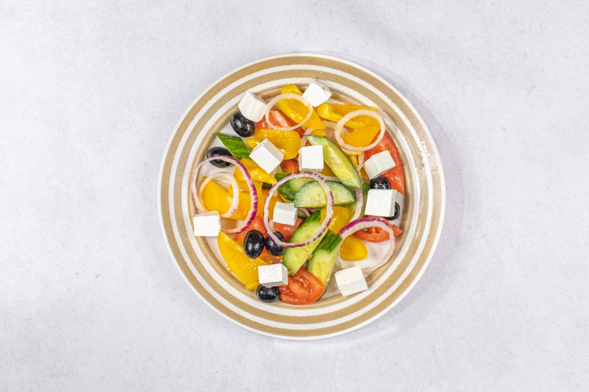 Kolorowa sałatak z pomidorkami, ogórkiem, papryką i pomarańczą, skropiona miodowym dressingiem
