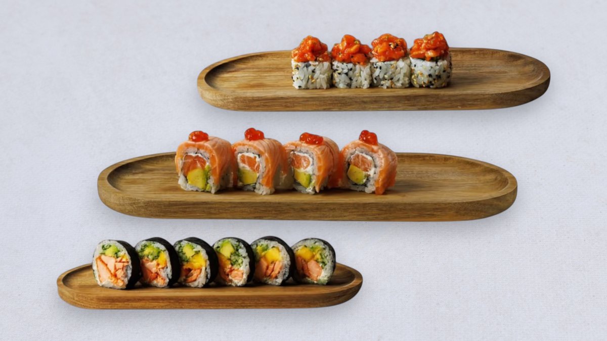44 szt. 8x uramaki z doradą 8x uramaki rainbow, 8x uramaki z tuńczykiem 8x uramaki z łososiem, 6x futomaki z krewetką 6x futomaki wege w tempurze☘️ Zestaw dla trzech osób: pałeczki x 3 sos sojowy x 3 imbir oraz wasabi zdęcie podglądowe