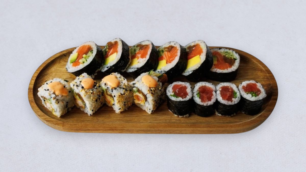 26 szt. 2x nigiri łosoś 2x tuńczyk akami 8x hosomaki tykwa marynowana☘️, 8x uramaki dorada, 6x futomaki z krewetką w tempurze. Zestaw dla dwóch osób: Pałeczki x2 sos sojowy (20 ml) x2 imbir oraz wasabi Zdjęcia podglądowe