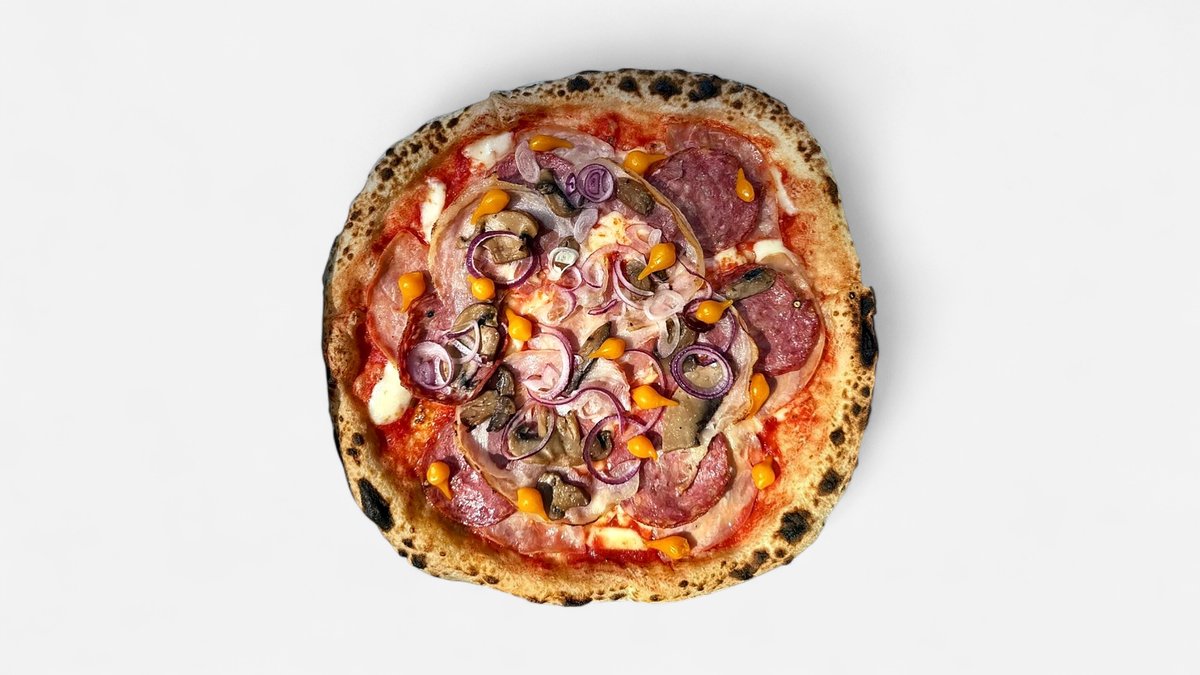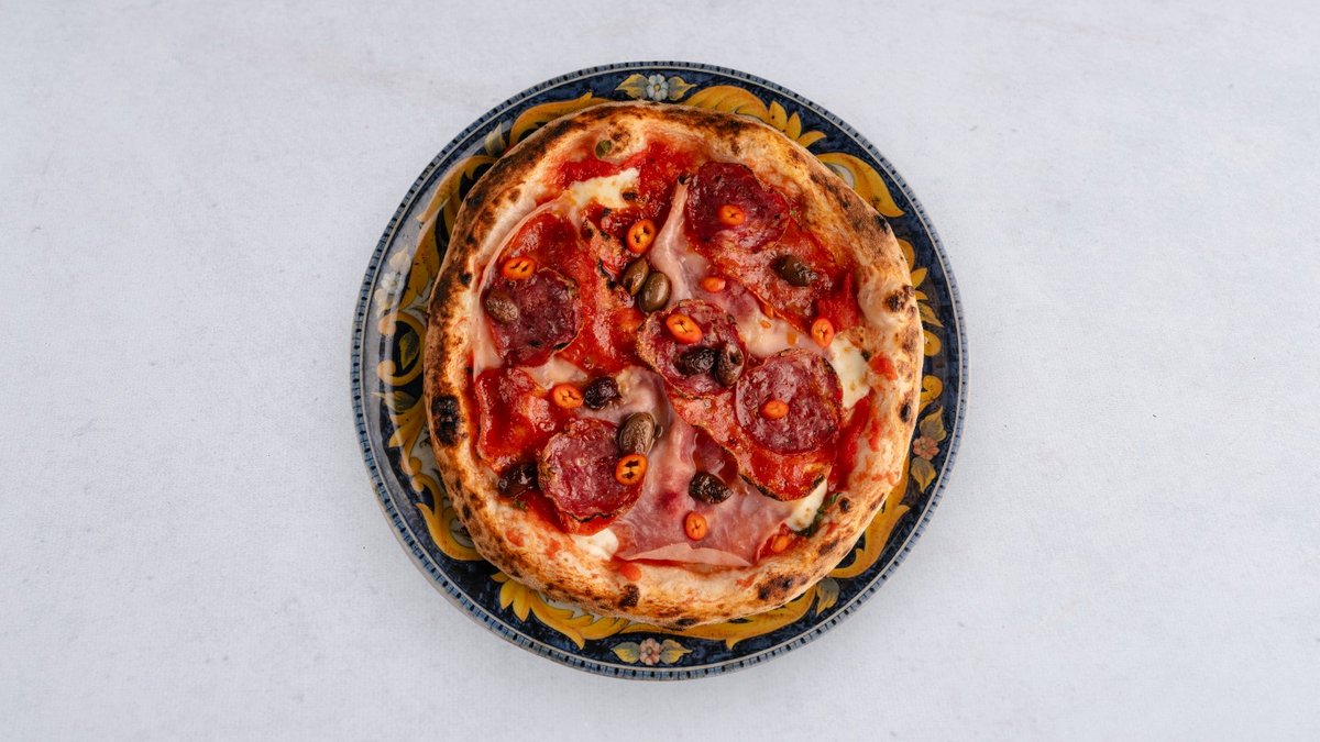 Pomidory San Marzano D.O.P., Mozzarella Fior di Latte, Pecorino Romano D.O.P., 'nduja, ricotta, cebulka karmelizowana, oliwa