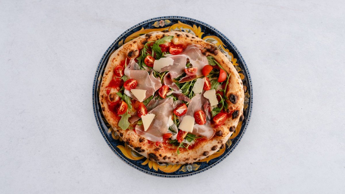 Pomidory San Marzano D.O.P., Mozzarella Fior di Latte, Prosciutto Crudo di Parma, Grana Padano, pomidorki koktajlowe, rukola, oliwa