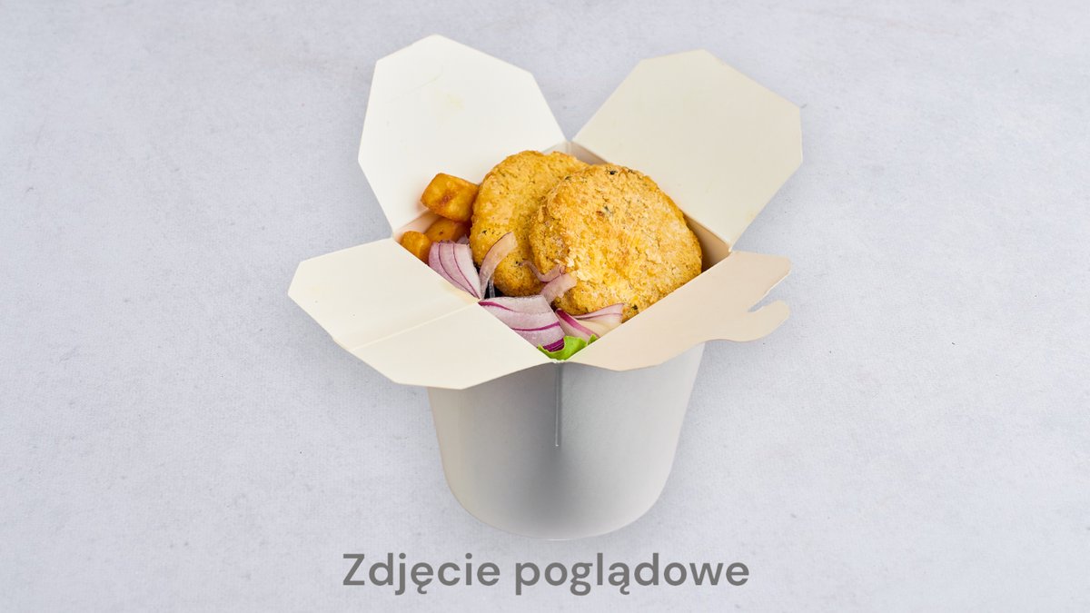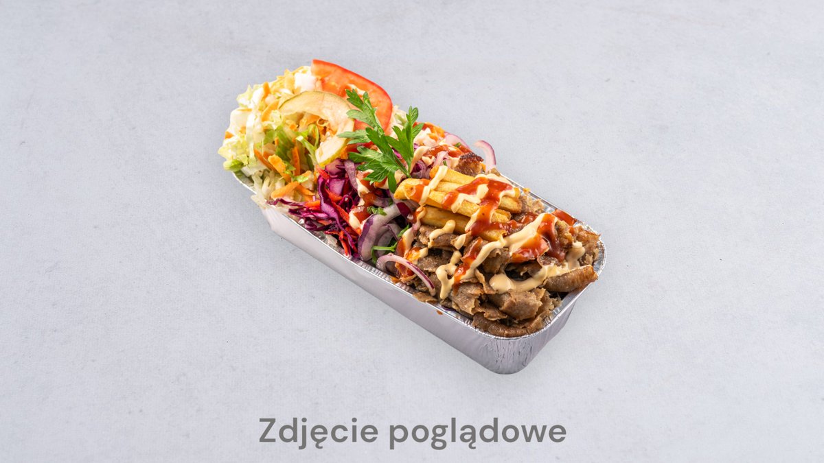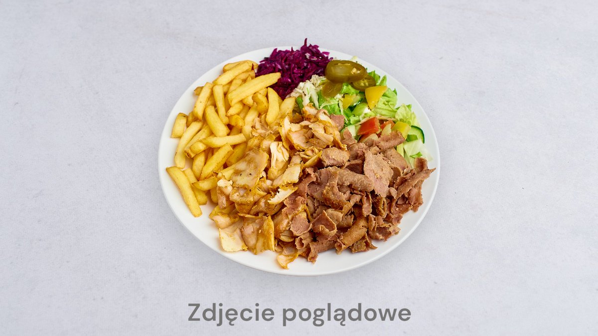 Mięso, frytki, surówka, czerwona kapusta, sałata lodowa, pomidor, cebula, sos