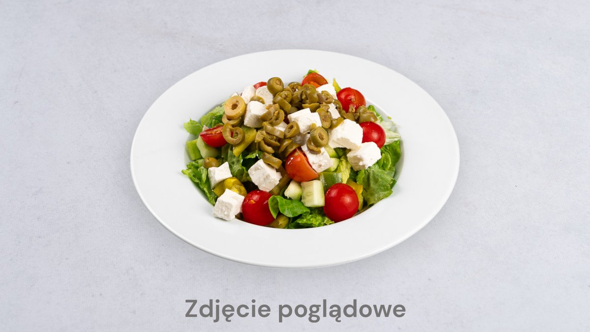 Surówki, sałata lodowa, ogórek, pomidor, cebula, oliwki, jalapeño, ser feta