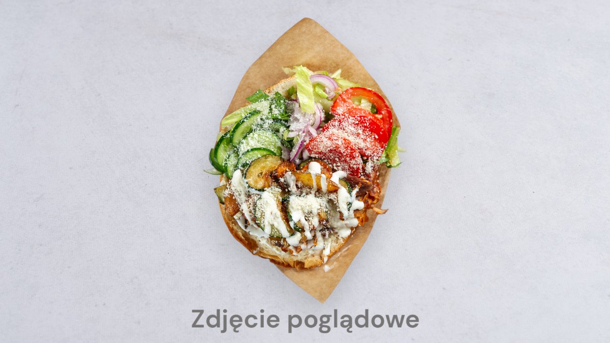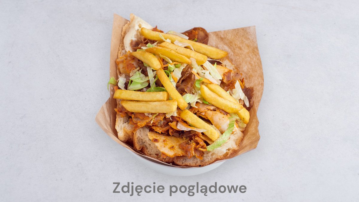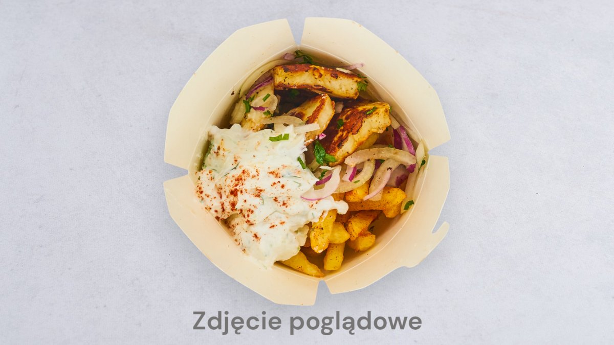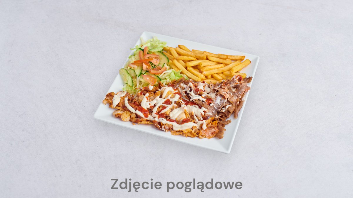 Mięso, surówka, frytki, ser złoty, ser halloumi, feta, jalapeño, oliwki, ogórki kiszone, sos