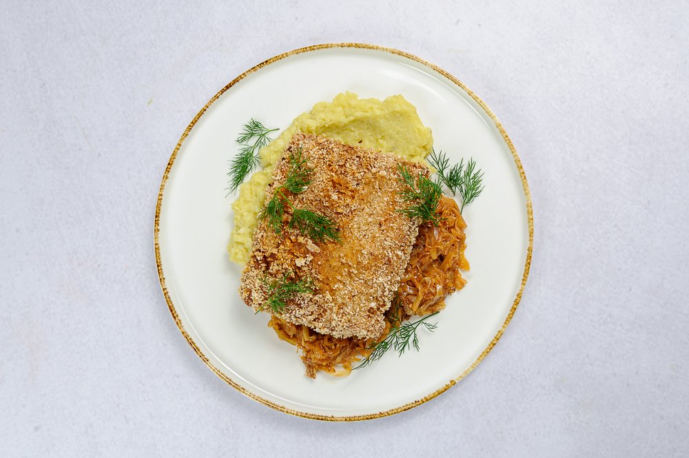 Sojowy kotlet w panierce, puree ziemniaczane z lubczykiem, zasmażana kapusta z grzybami leśnymi, koper