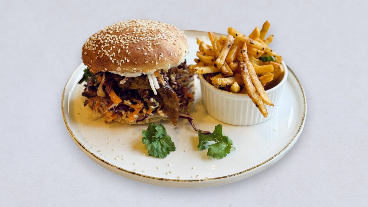 Szarpane białko konopne w glazurze hoisin, domowa "maślana" bułka, sałatka ze świeżych warzyw z cytrusowym dressingiem, orzeszki ziemne, cebulka prażona, "majonez" 5 smaków, frytki z ziemniaka z czosnkiem, chilli i dymką
