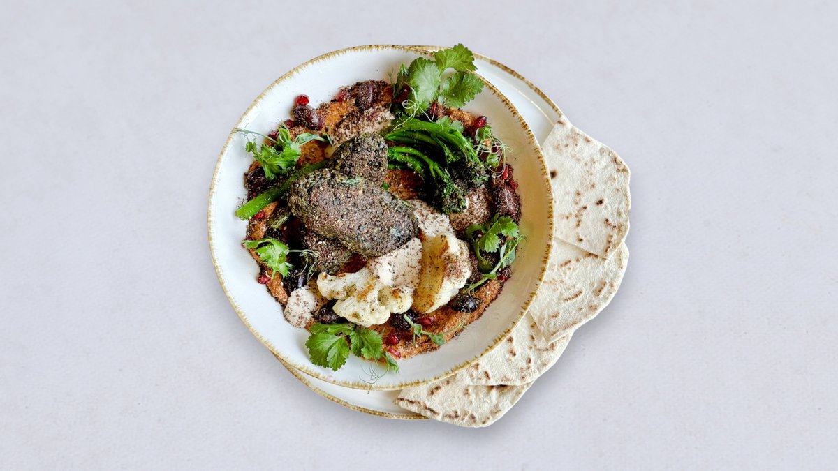 kofty z czarnej soczewicy podane na paście z pieczonej papryki i orzechów włoskich (muhammara), podpiekany w ziołowej oliwie kalafior i dziki brokuł, oliwki kalamata, granat, kolendra, listki botwinki, sos tahini, za’atar, domowa pita (wersja bezglutenowa bez pity)