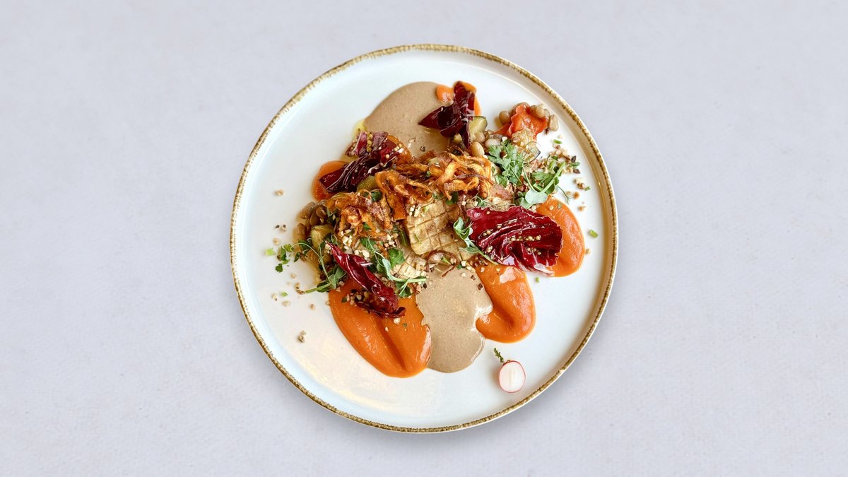 steki z selera z sosem z orzechów laskowych i miso, puree z marchewki z dodatkiem gochujang, duszona fasola z papryką i cukinią, sałatka z raddichio z musztardą francuską, chipsy marchewkowe, orzechy laskowe