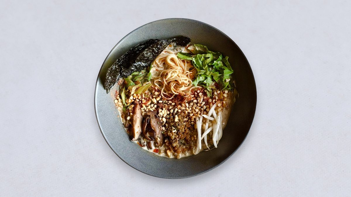 gęsty orzechowo- sezamowy bulion, makaron alkaliczny, mielone “mięso” sojowe, pak choi, kiełki mung, grzyby shitake, orzeszki ziemne, dymka, przyprawa tougarashi, glony nori, olej chili (wersja bezglutenowa z makaronem gryczanym soba)