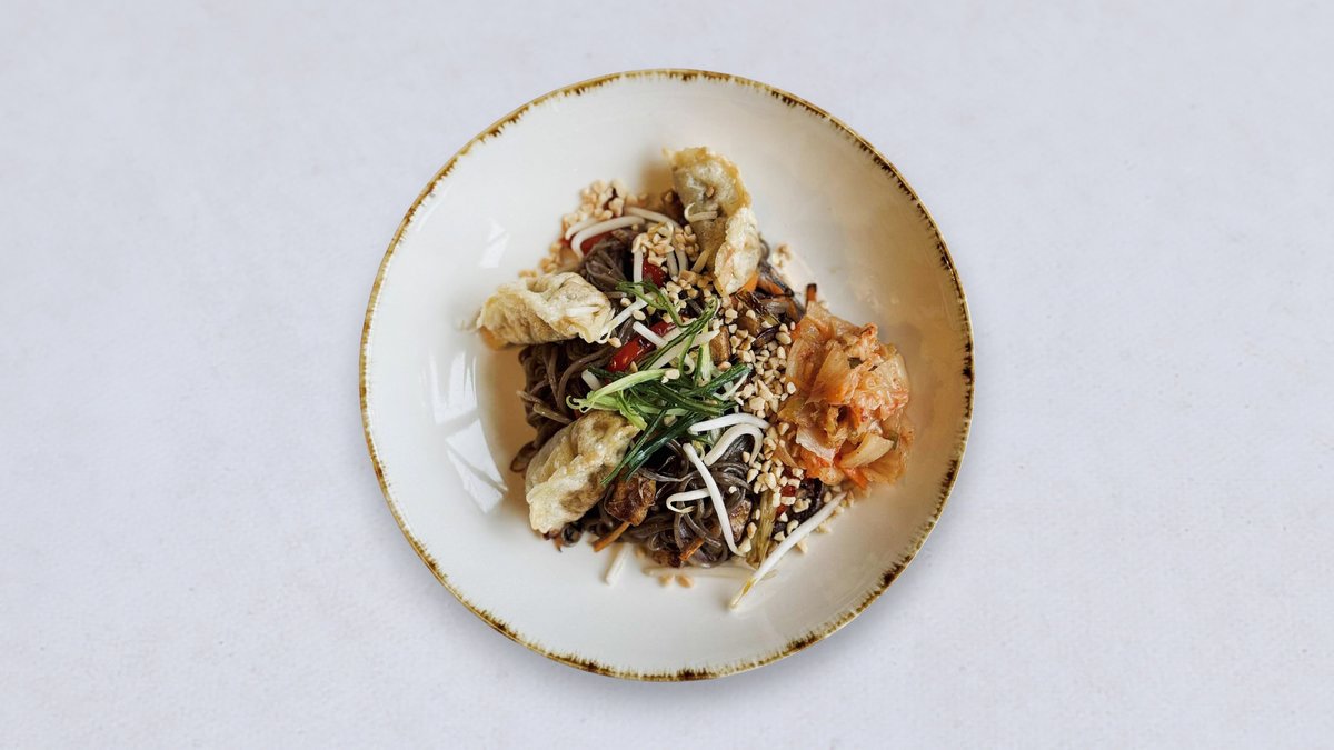 smażony makaron soba w sosie syczuańskim z tofu i warzywami, chrupiące pierożki GYOZA z grzybami i edamame, kimchi, orzeszki ziemne, por, kolendra (wersja bezglutenowa bez pierożków)
