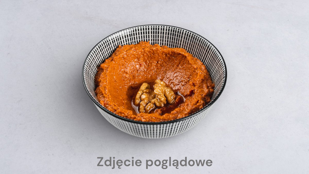 pasta z pieczonej papryki i orzechów włoskich, świeże warzywa, domowa pita
