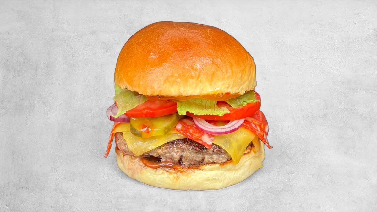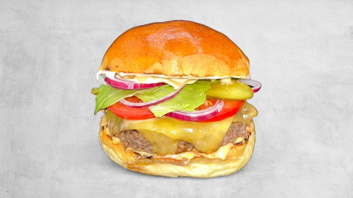 200g wolowiny,bułeczka,domowy majonez, sos firmowy, ser Cheddar, sałata, ogórek marynowany,pomidor czerwona cebula marynowana