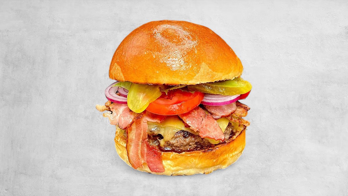 200g wołowiny, bułeczka,boczek, ser Cheddar, salata, pomidor, ogórek konserwowy, czerwona cebula marynowana, cebulka prażona,sos firmowy ,sos barbecue
