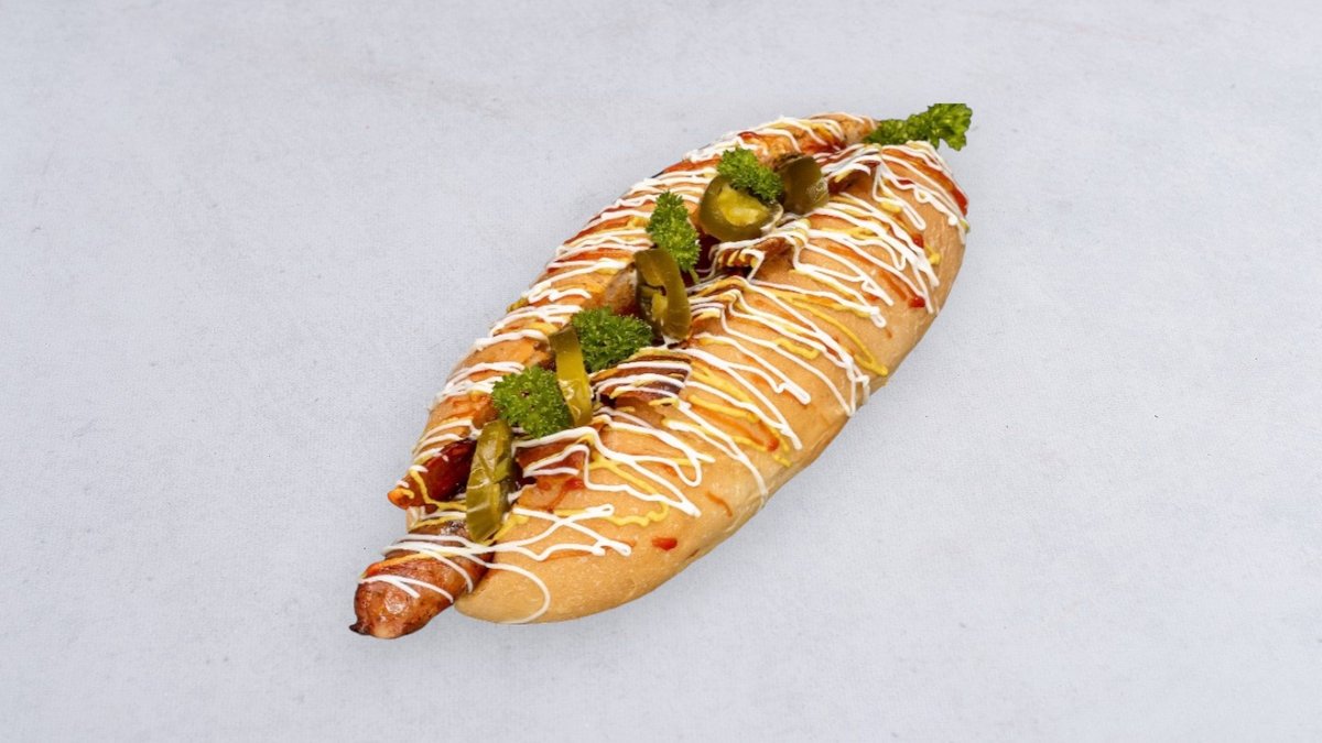 Kraftowa kiełbasa wieprzowa,sos firmowy, cebula marynowana, kiełbaska Chorizo, papryczki jalapeño, ketchup, musztarda, sos sriracha-majo