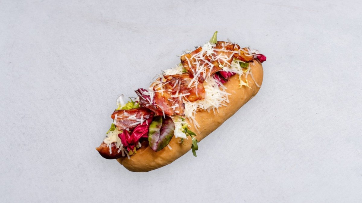 Kraftowa kiełbasa wieprzowa,sos majo,domowa bułka,sałata lodowa,boczek, sos "Cezar", parmezan