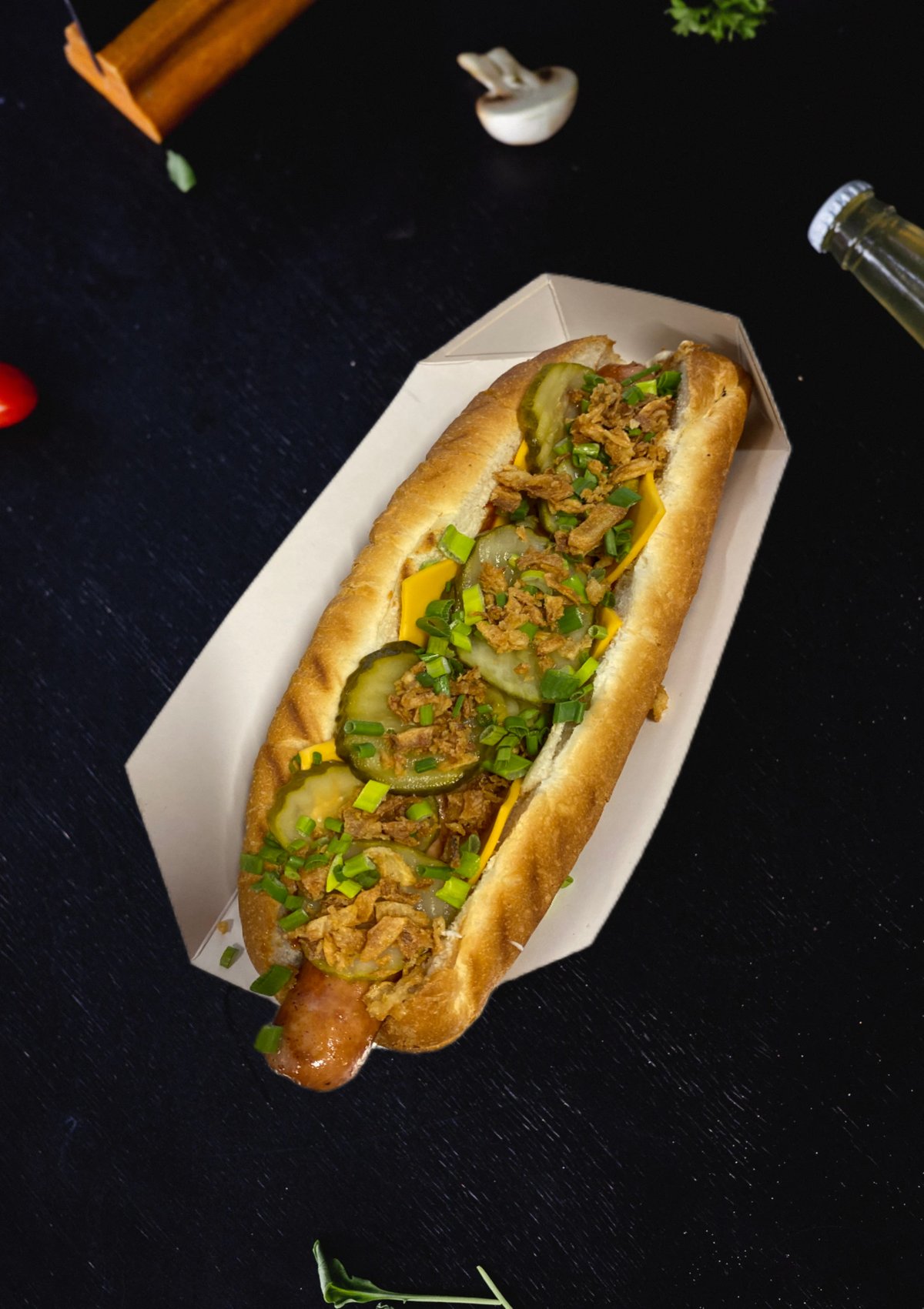 Kraftowa kiełbasa wieprzowa,ser Cheddar , bułka,ketchup, majonez,ogórek konserwowy, szczypiorek, cebulka prażona