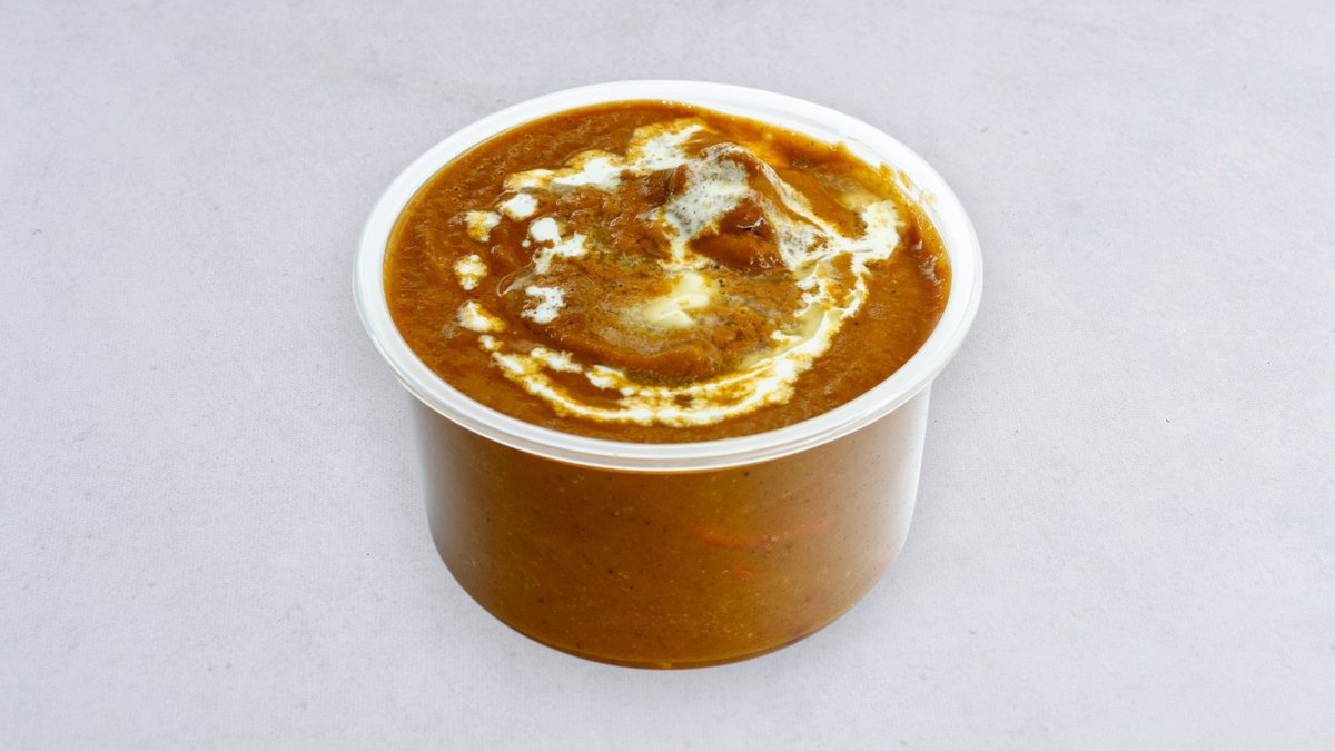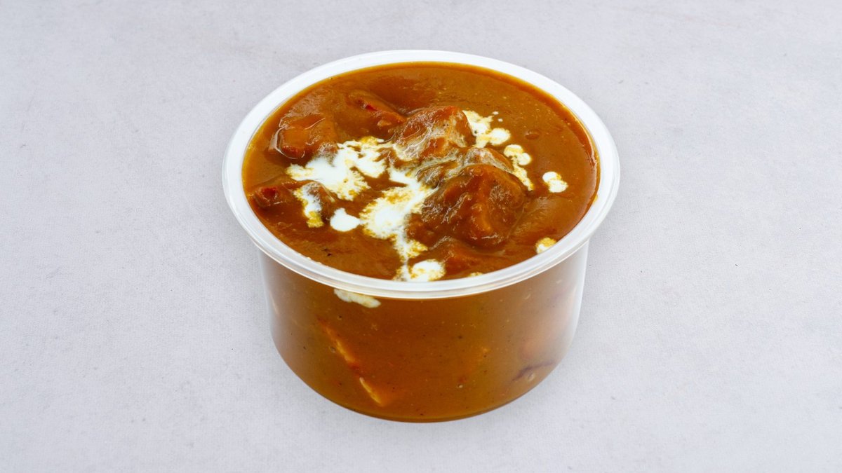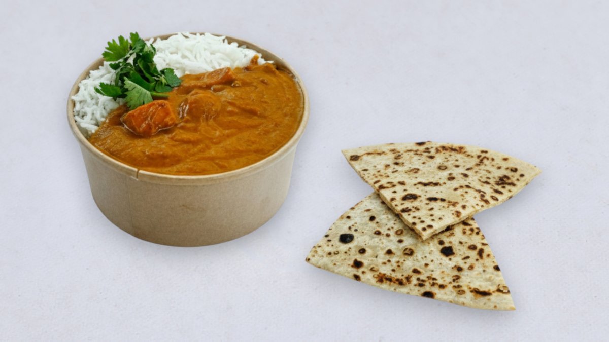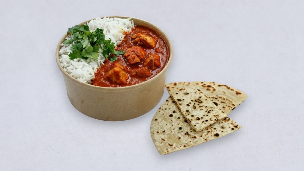 Kawałki piersi kurczaka gotowane w kremowym sosie pomidorowo-maślanym. Podawane z ryżem Basmatii i Paratha (Indyjskim chlebkiem).