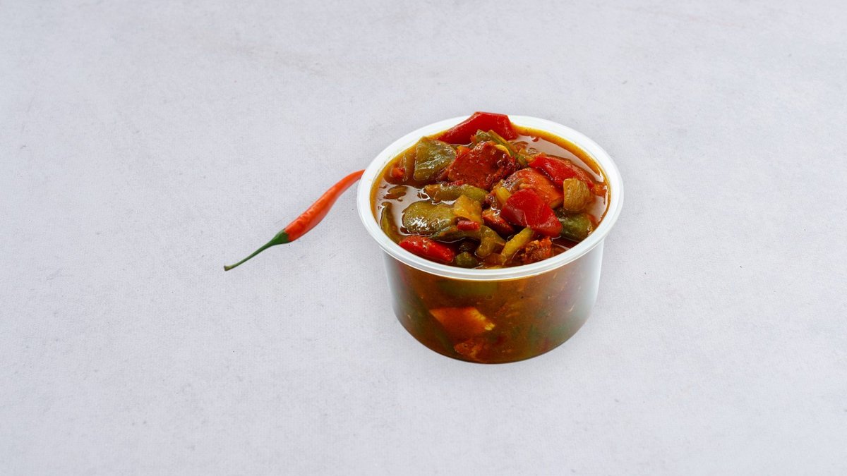 Ciecierzyca gotowana w ostrym sosie z kawałkami papryki, cebuli i chili