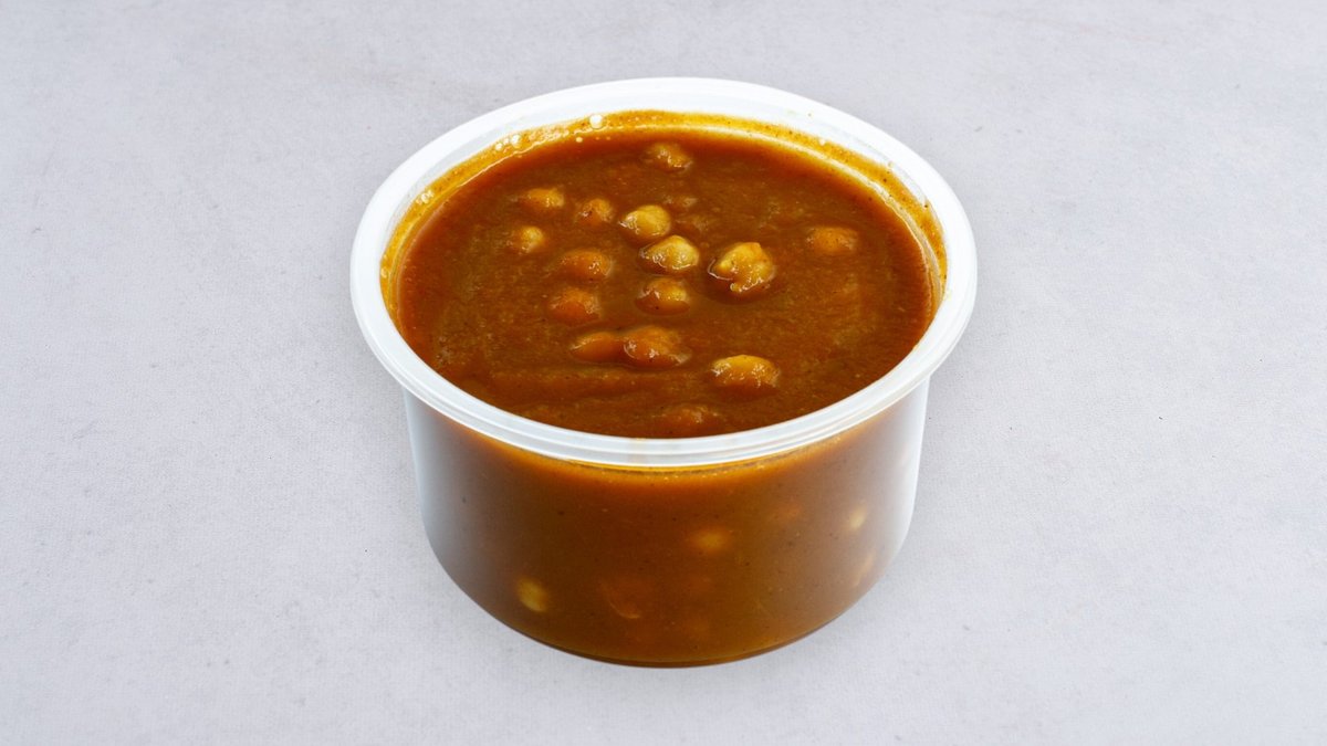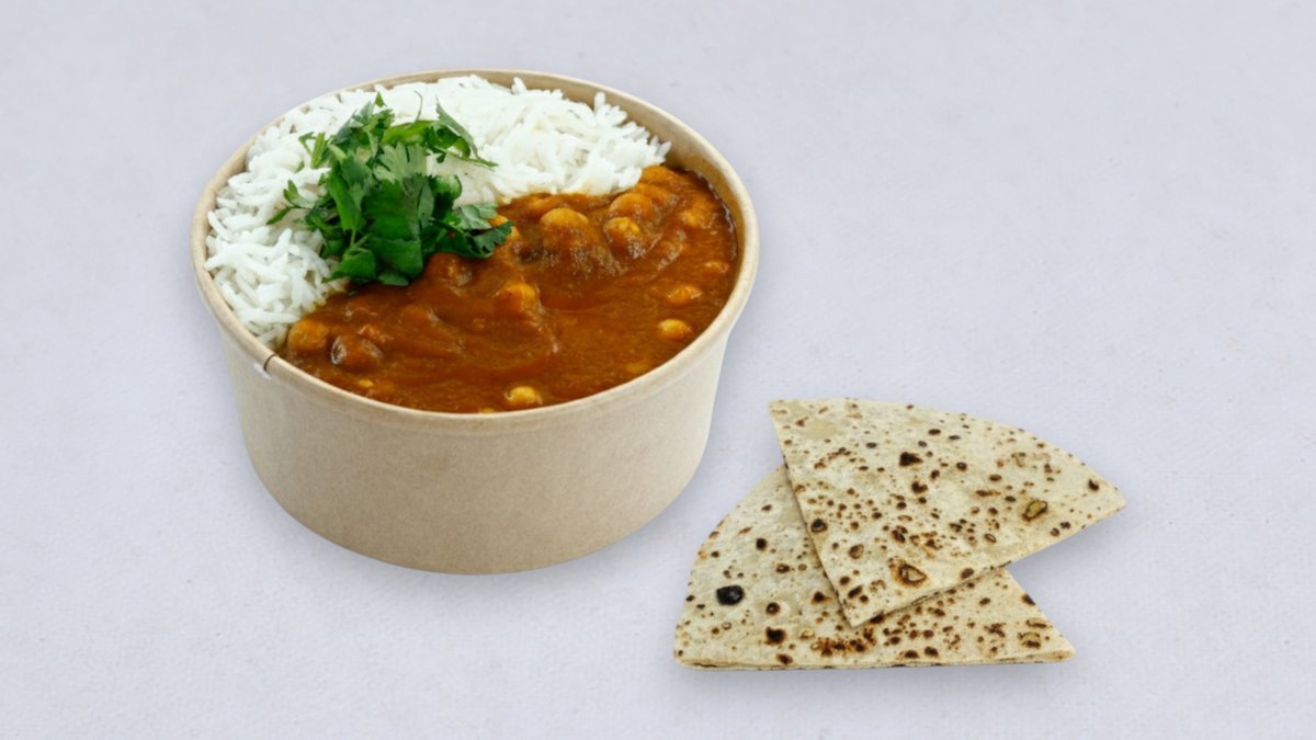 Ciecierzyca gotowana w aromatycznym sosie curry. Podawane z ryżem Basmatii i Paratha (Indyjskim chlebkiem).