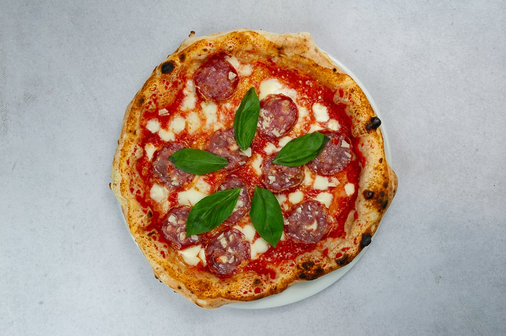 Pomidory, mozzarella fior di latte, salami napoli, czosnek, pecorino romano, bazylia, oliwa