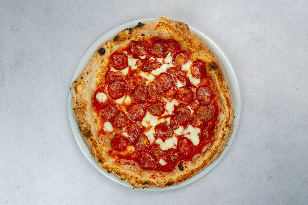 Pomidory, mozzarella fior di latte, salami piccante, pecorino romano, bazylia, oliwa