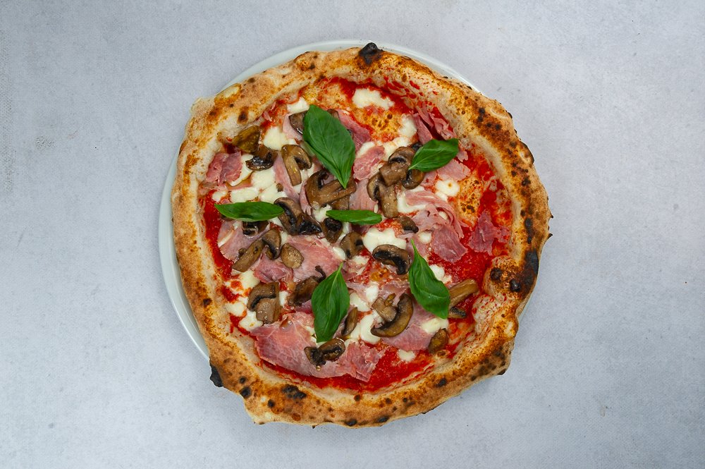 Pomidory, mozzarella fior di latte, szynka cotto, pieczarki, pecorino romano, bazylia, oliwa