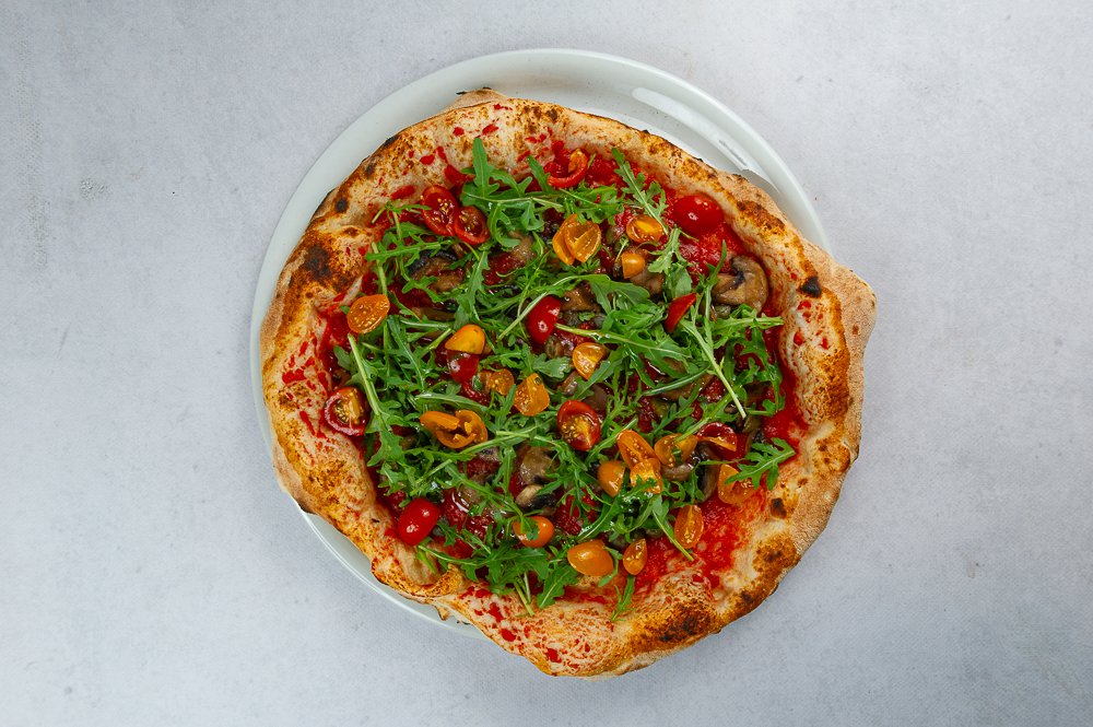 Pomidory, pieczarki, kapary, pomidorki datterini, rukola, oliwa