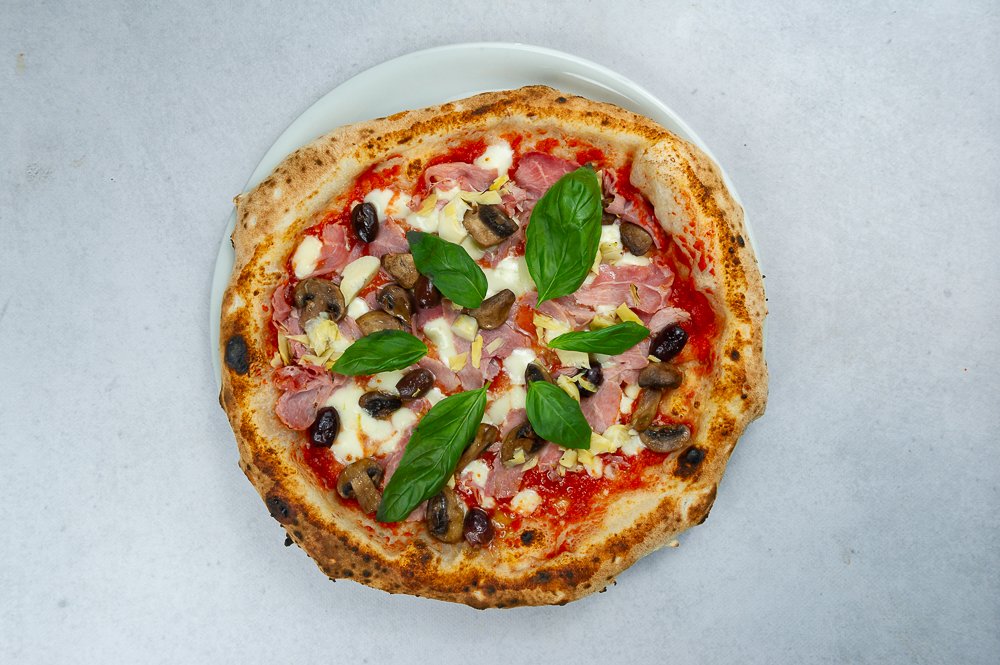 Pomidory, mozzarella fior di latte, szynka cotto, pieczarki, karczochy, oliwki, pecorino romano, bazylia, oliwa