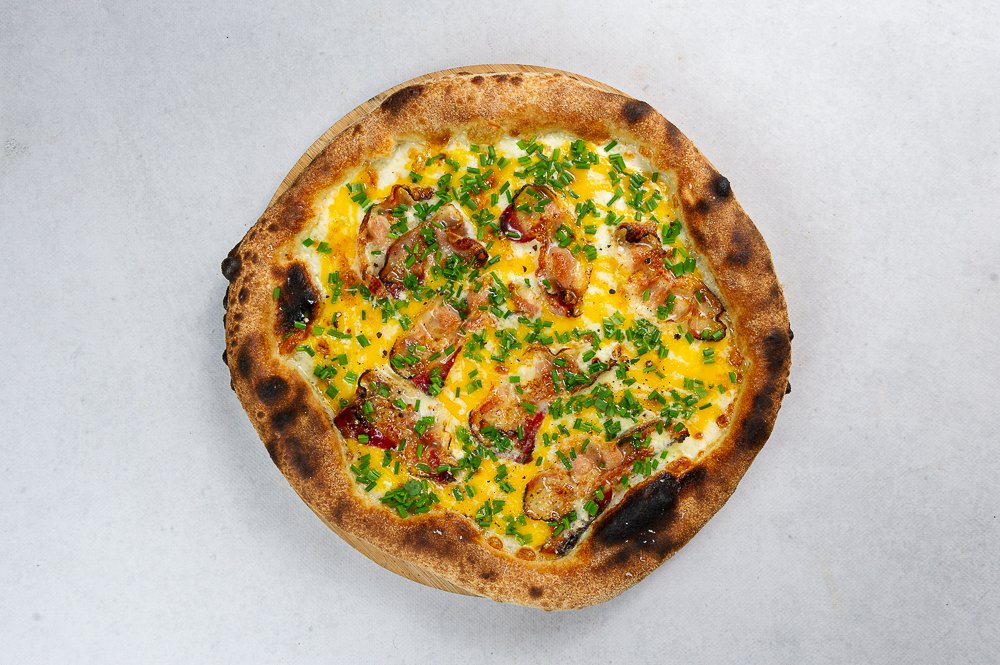 Guanciale, mozzarella, żółtko, ser bursztyn, szczypiorek, pieprz