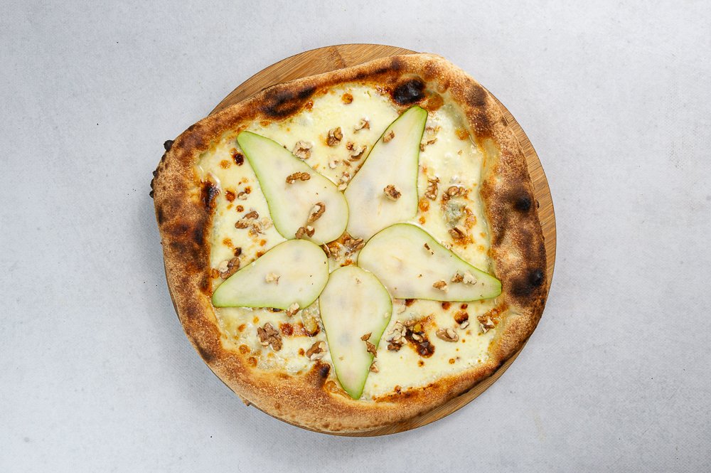 Sos biały, mozzarella, gorgonzola, gruszka, prażony orzech włoski