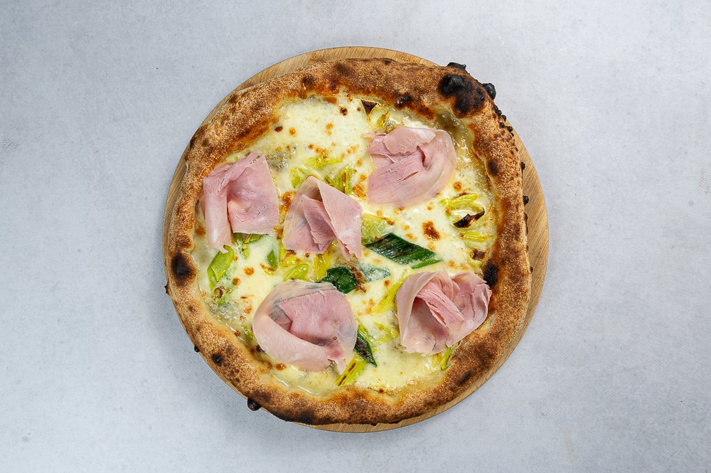 Sos biały, szynka Cotto, gorgonzola, pieczony na maśle por