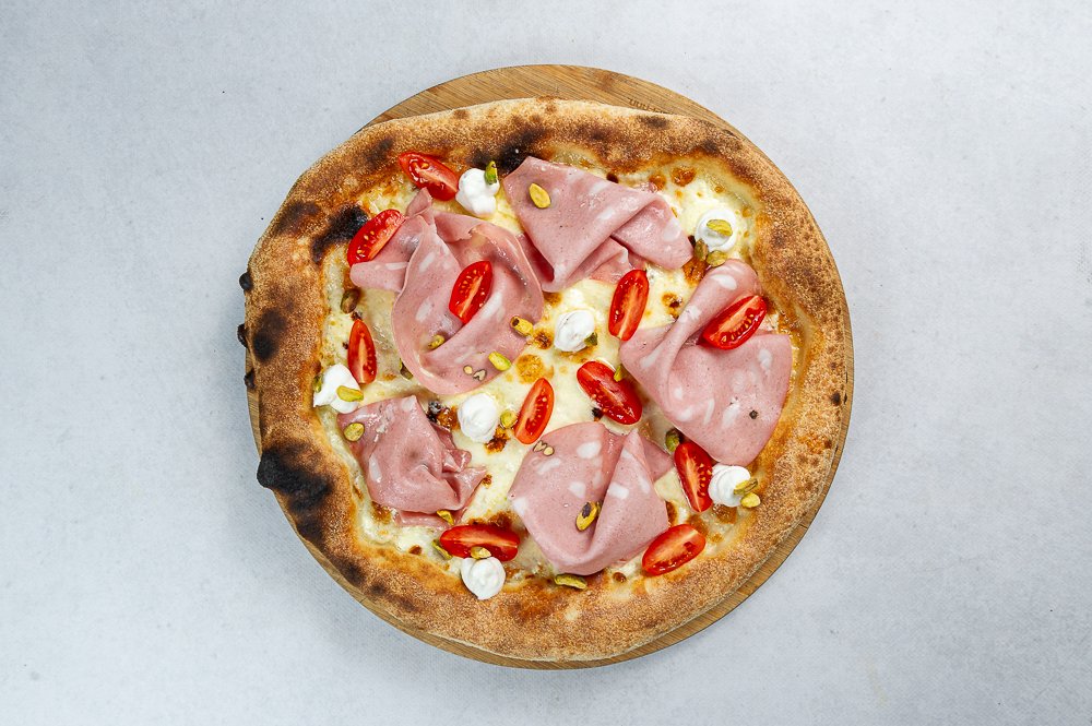 Sos biały, mortadela, Labneh, pomidorki koktajlowe, pistacja