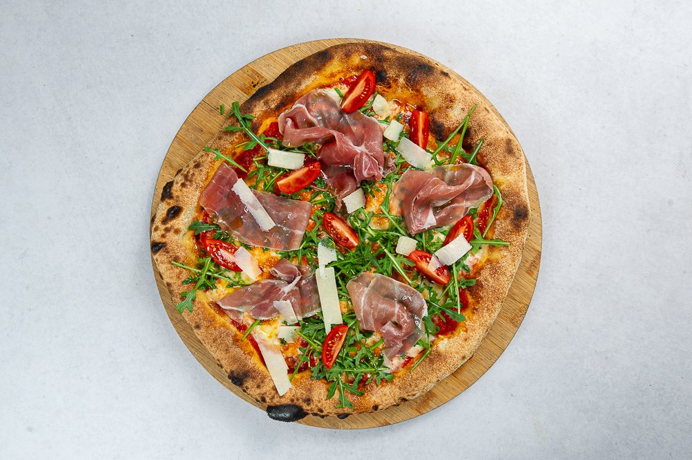 Sos pomidorowy, mozzarella, Prosciutto, brzoskwinia, rukola, ser Grana Padano