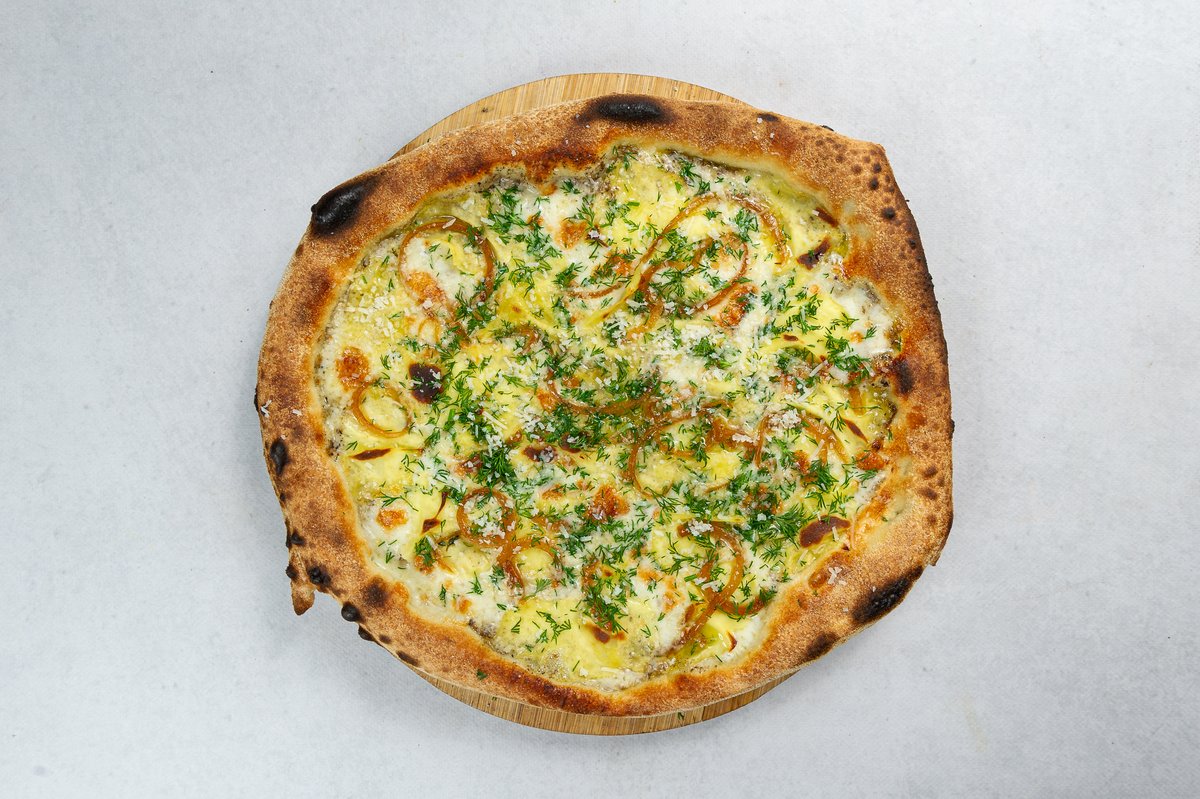 Truflowy sos, mozzarella, cebula marynowana, plasterki ziemniaka, koperek, parmezan
