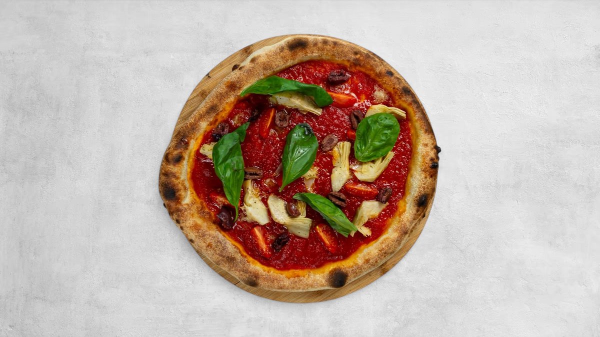 Sos pomidorowy, karczochy, pomidorki koktajlowe, oliwki, świeża bazylia