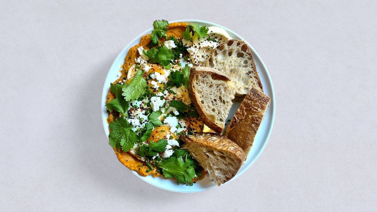 2 jajka sadzone, wędzone masło z chilli, pasta z dyni i masła orzechowego, feta, czarny sezam, gochugaru, kolendra, ubijane masło, pieczywo