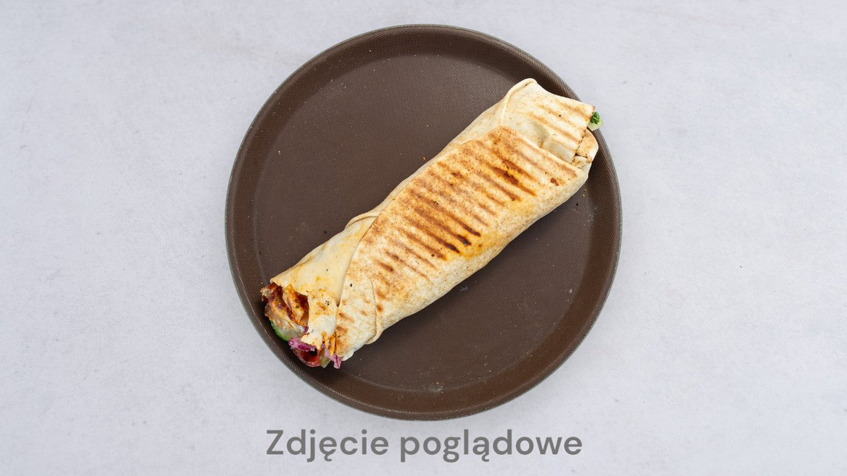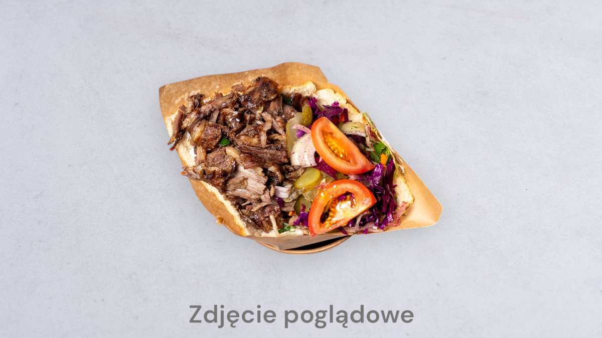 Z wołowiną, serem feta, czarnymi oliwkami, zielonym ogórkiem, czerwoną cebulą, pomidorem, sałatą i 2 sosami do wyboru