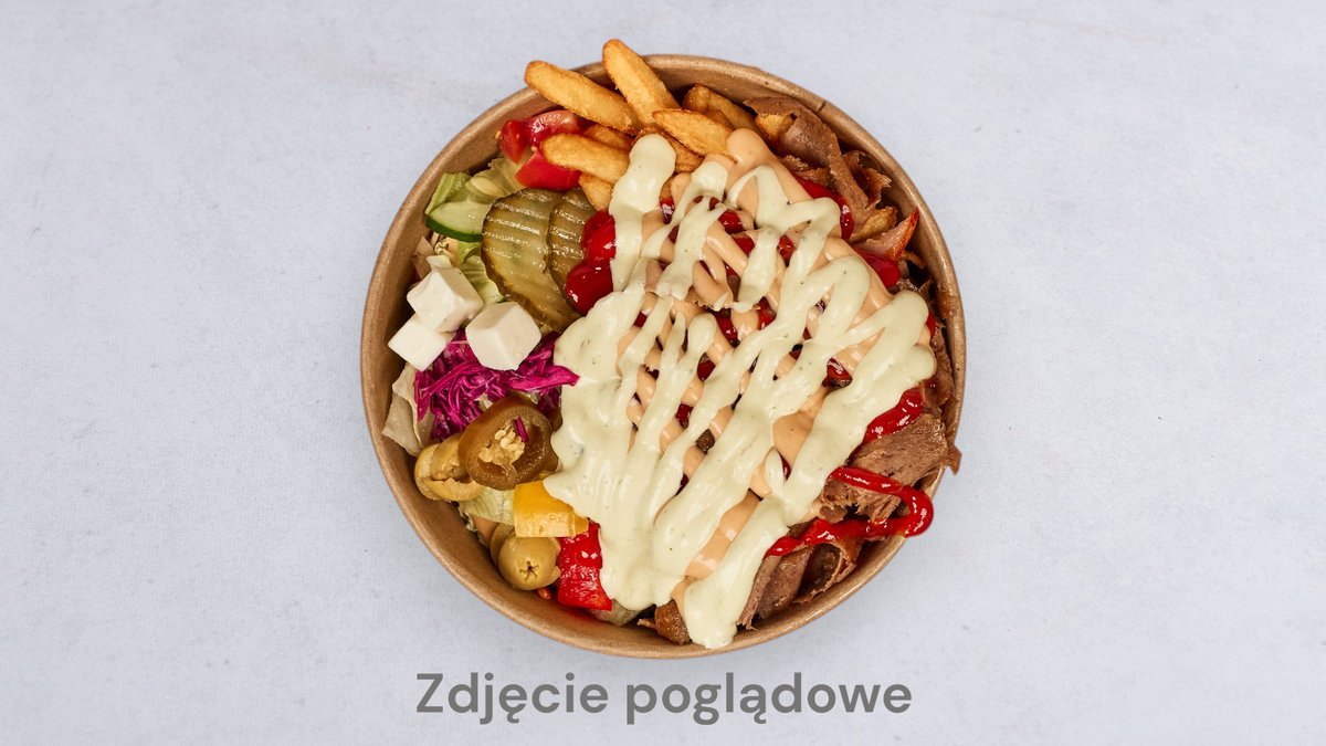 Mięso, frytki, sos, specjalna sałatka, ser feta, oliwki
