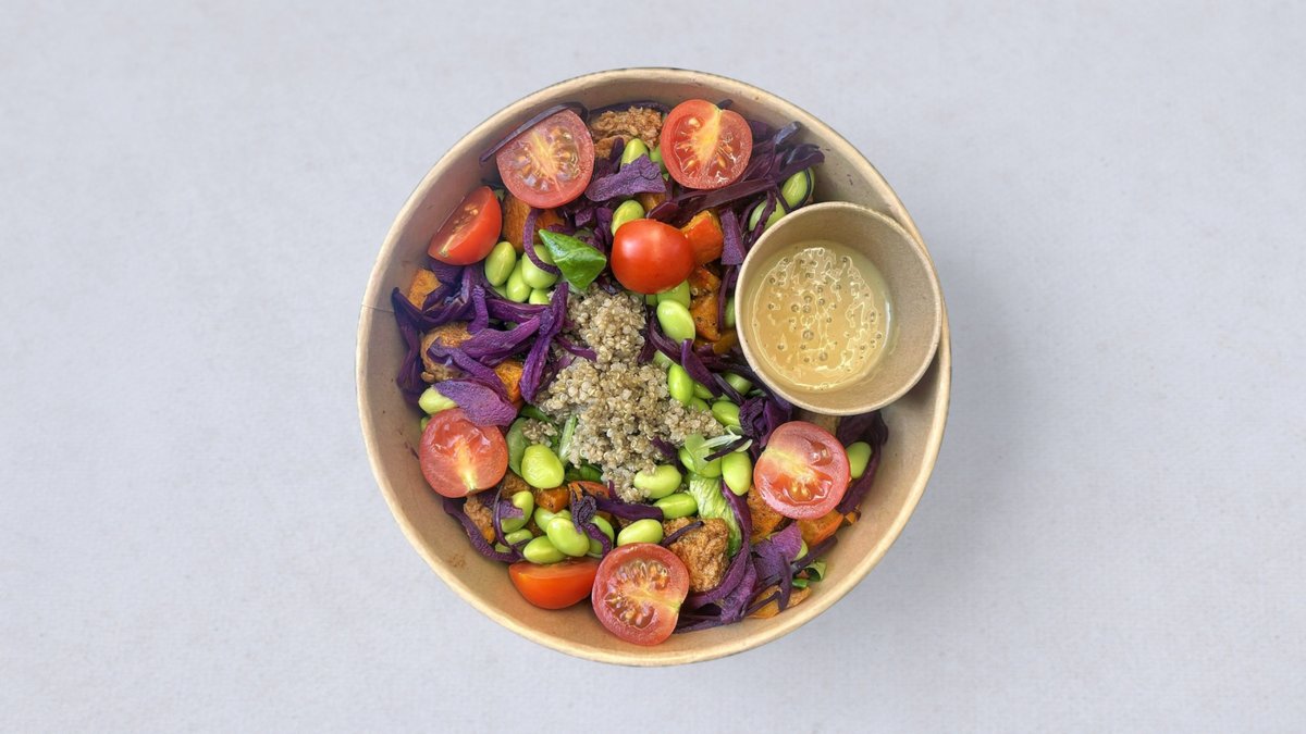 Komosa ryżowa, edamame, wege kurczak wędzony, pieczona dynia, pomidory, marynowana czerwona kapusta , mix sałat, sos musztarda- klon ZAWIERA AŻ 40 g BIAŁKA!
