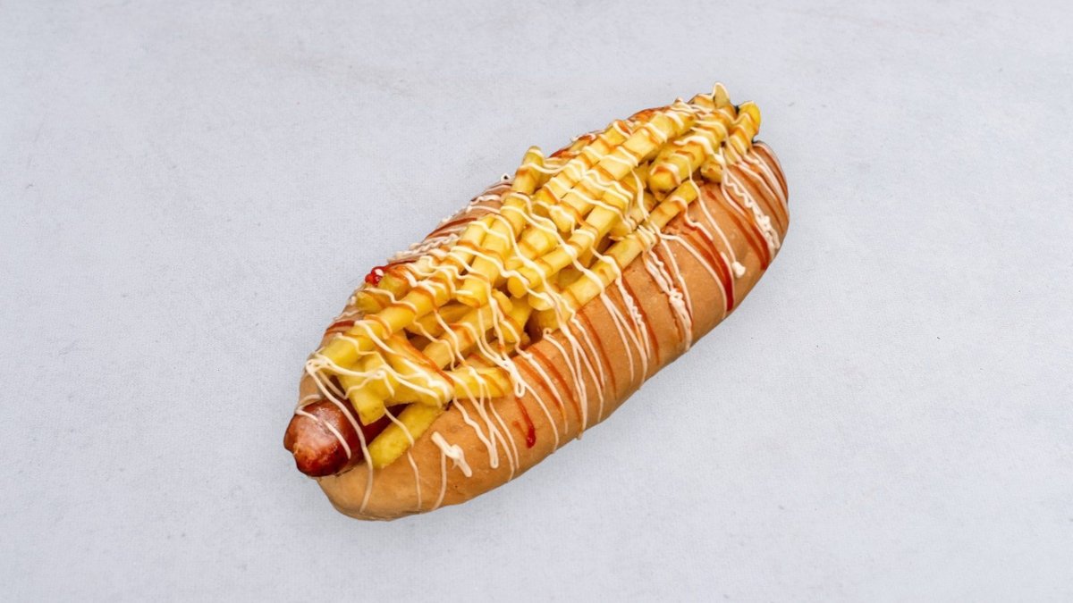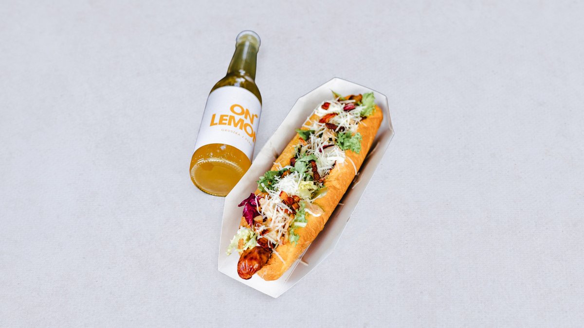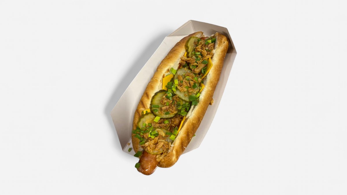 Kraftowa kiełbasa wieprzowa, ser Cheddar, chipsy z boczku,ketchup, majonez domowy,, ogórek konserwowy, szczypiorek, cebulka prażona