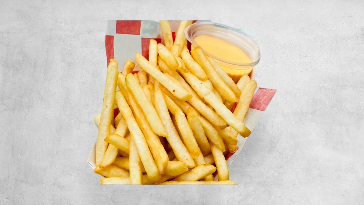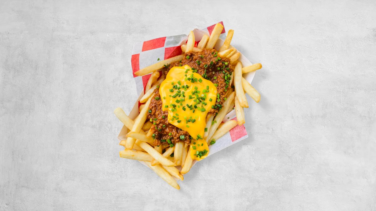 Frytki z sosem z wolno duszonej wołowiny, sos Cheddar, szczypiorek 300 g