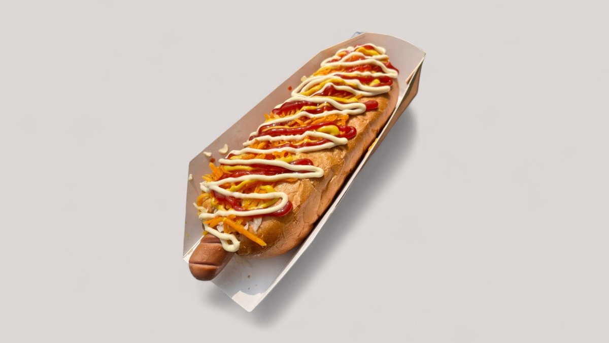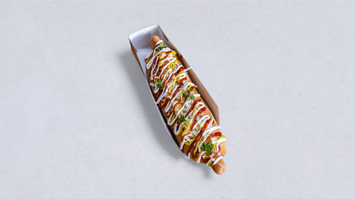 Domowa bułeczka, parówka, surówka z białej kapusty, marchewka po koreańsku, keczup, musztarda, majonez
