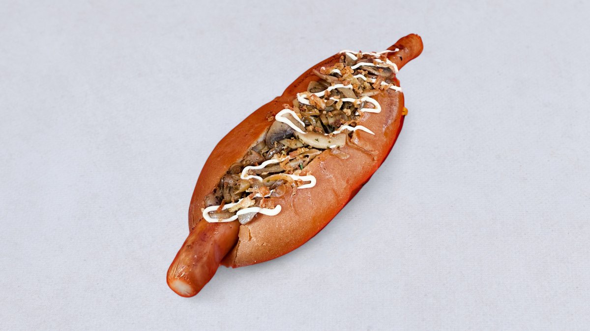 Kraftowa kiełbasa wieprzowa, bułka, sałata lodowa, pieczarki smażone z cebulką, ser Cheddar, sos trufflemajo, sos majo, cebulka prażona