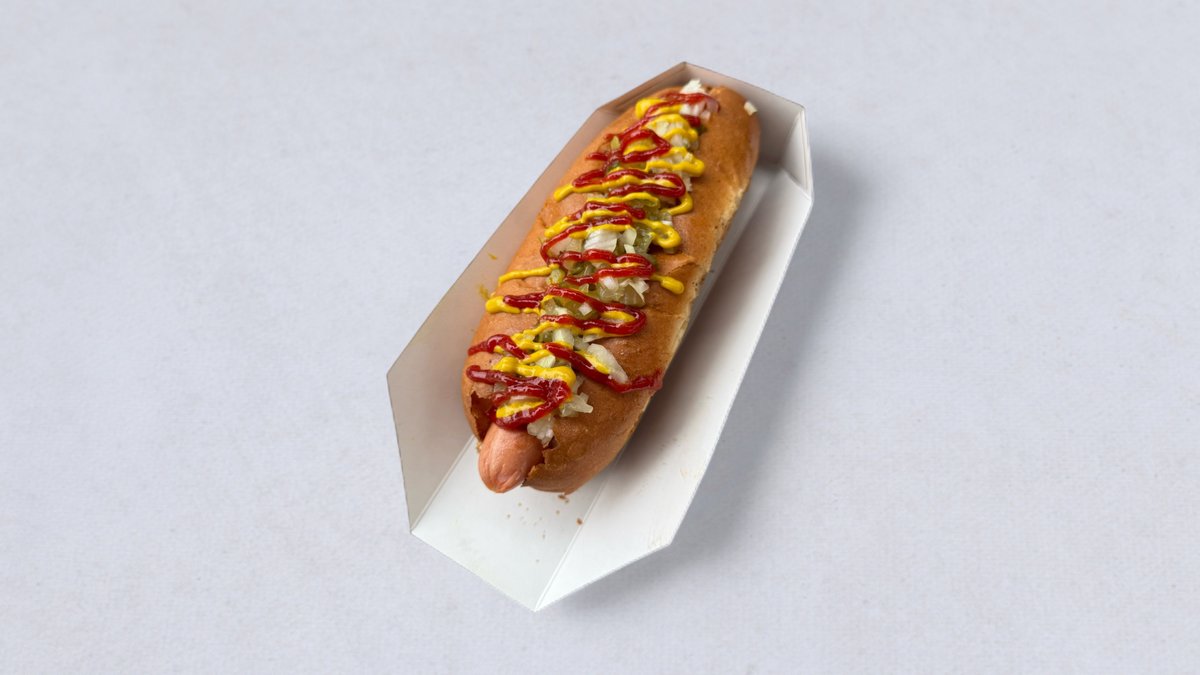 Parówka, domała bułeczka, musztarda, ketchup, ogórek marynowany, cebula