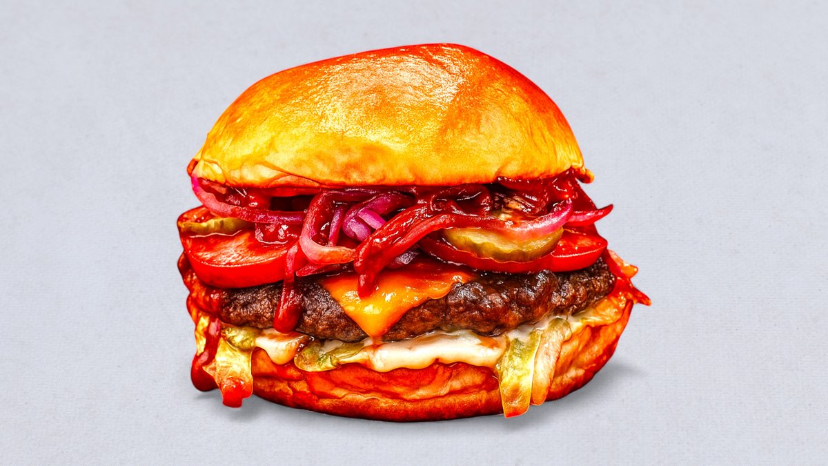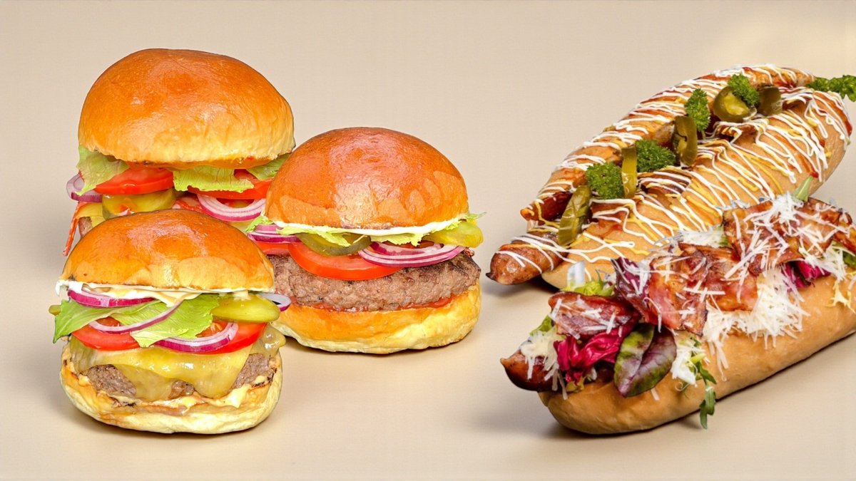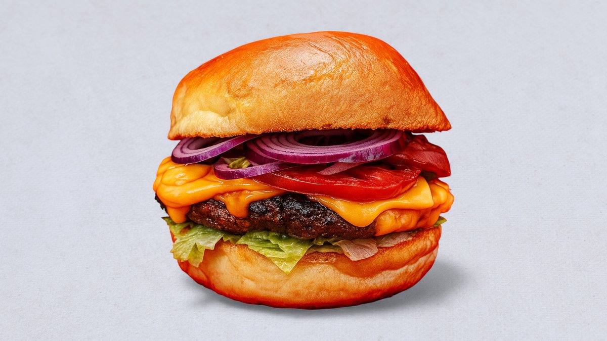 200 g wołowiny, bułeczka, domowy majonez, sos firmowy, ser Cheddar, sałata, ogórek marynowany, czerwona cebula marynowana