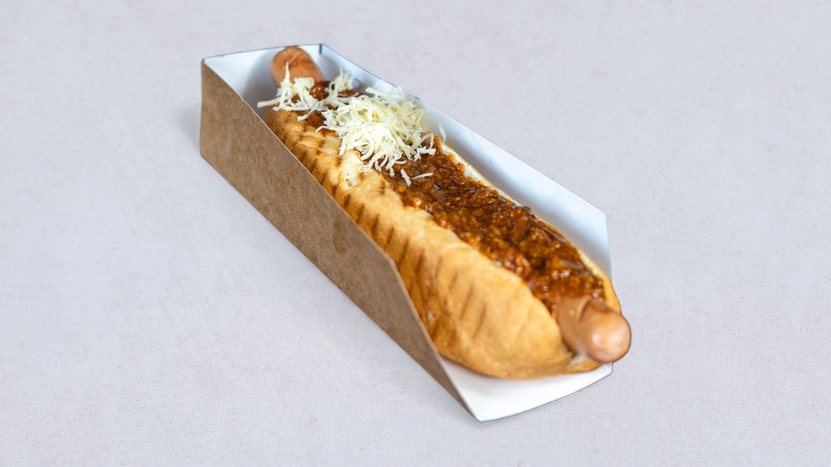 Firmowy, parówka, sos "Coney Island" - wołowinka w tomatach, ser żółty