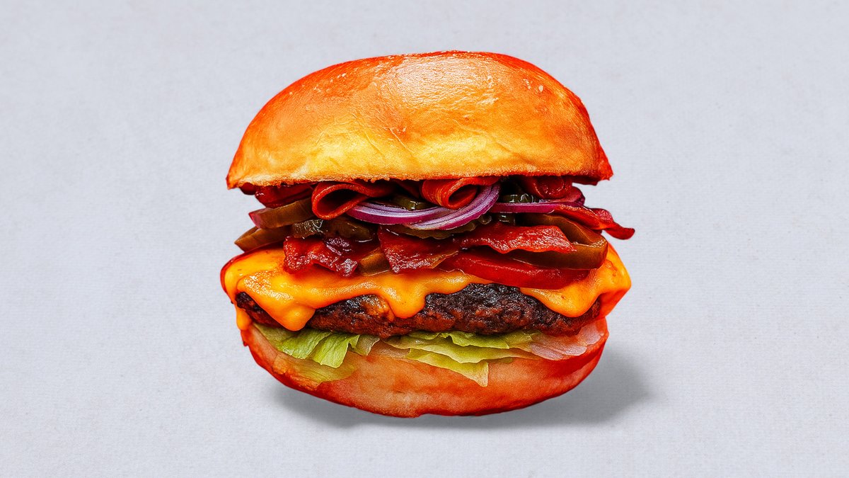 200 g wołowiny, bułeczka, boczek, ser Cheddar, sałata, ogórek konserwowy, czerwona cebula karmelizowana , cebulka prażona, sos firmowy, sos barbecue