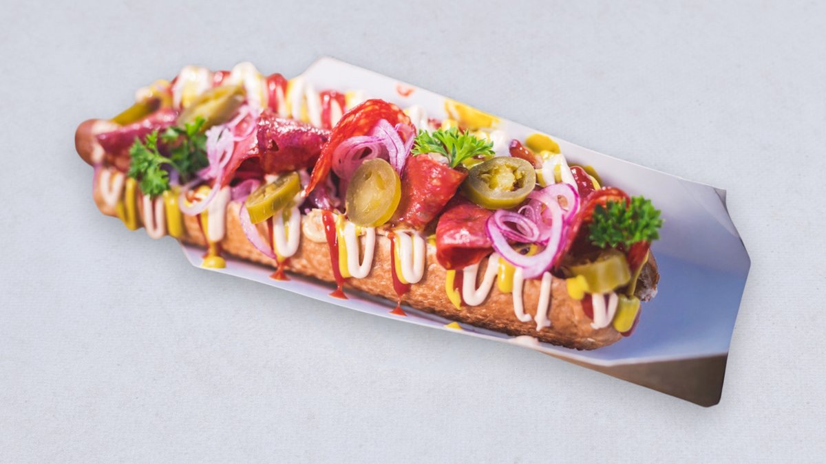 Kraftowa kiełbasa wieprzowa, sos firmowy, cebula marynowana,kiełbaska Chorizo, papryczki padron,ketchup, musztarda, sos sriracha-majo