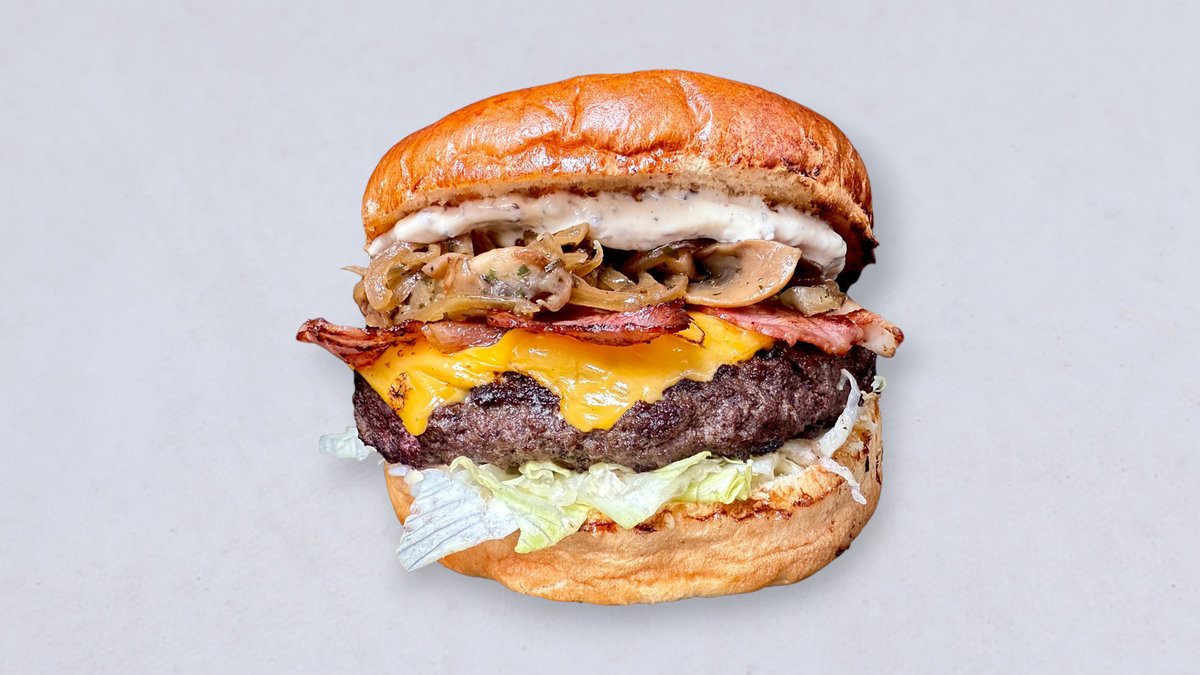 200 g wołowiny,bułka,pieczarki smażone z cebulą, sałata lodowa,boczek, ser Cheddar,sos trufflowy, sos majo, cebulka prażona